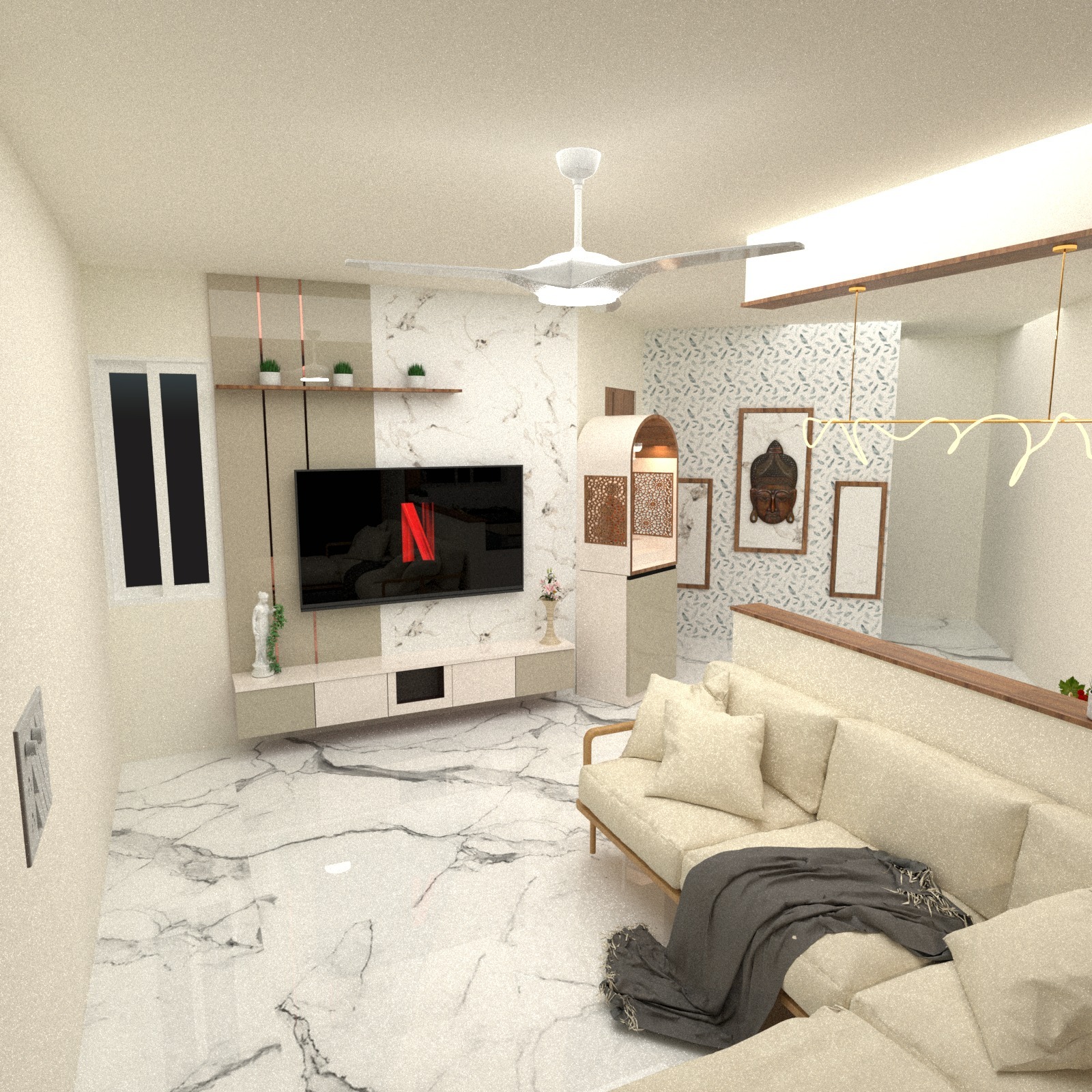 This premium living room interior is beautifully designed and executed by Highland Modular Kitchens & Interiors Pvt. Ltd., showcasing a perfect blend of modern elegance and smart space planning. The wooden false ceiling with warm lighting adds richness and depth, while the marble-finish wall panels create a luxurious and timeless appeal. The stylish TV unit, open wooden shelving, and decorative hanging planters enhance the overall aesthetic and functionality. Every element is crafted with precision to deliver comfort, sophistication, and durability, making this living space a true reflection of superior design excellence and contemporary lifestyle.
