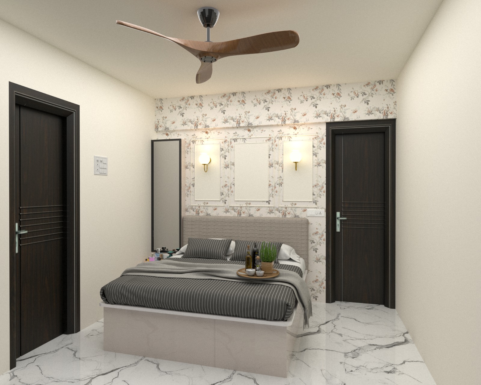Back Wall Design: The headboard wall can feature a wallpaper design that complements the color scheme. Consider a textured wallpaper (e.g., faux leather, geometric patterns, or a subtle floral print) in a neutral or contrasting color for added elegance.